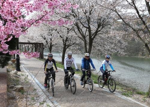 벚꽃이 활짝 핀 오천자전거길 괴강교인증센터∼칠성 구간이 자전거를 즐기는 사람들과 산책하는 ...
